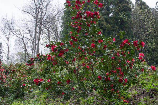 薪炭利用が次第に減少してくる中、雑木の中でも薪炭に不向きで伐採されずに生き延びてきた雪椿の木が次第に増殖し、現在のような大群生地になったものと思われます。しかし現在は雪椿の群生地の上を大木が覆いかぶさり、下の雪椿まで太陽の光が届かず次第に雪椿そのものが消滅の一途をたどるようになりました。